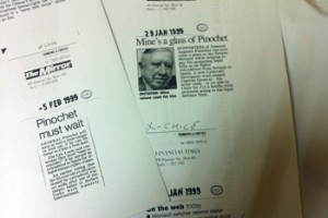 Una vez en las oficinas de CIPER, procedimos a abrir la maleta. Estábamos expectantes por conocer la interesante información que contendrían los documentos solicitados. Los sobres fueron abiertos y los documentos recorridos con rapidez: ¡eran principalmente recortes de prensa! Comunicaciones que la embajada chilena en Londres enviaba a Santiago con el resumen de la cobertura del juicio a Pinochet en los medios británicos. Hubo excepciones, sí, pero muy pocas y la mayoría conteniendo información pública en ese momento, como los alegatos en las cortes. Otras excepciones son el reenvío de un fax proveniente del Foreign Office (ver documento); una minuta política urgente del embajador Mario Artaza que resume los puntos de vista del director Jurídico, Jaime Lagos, y el director de Planificación, Alberto Van Klaveren, sobre la autorización de extradición (ver documento); y una minuta de Lagos analizando uno de los alegatos (ver documento).