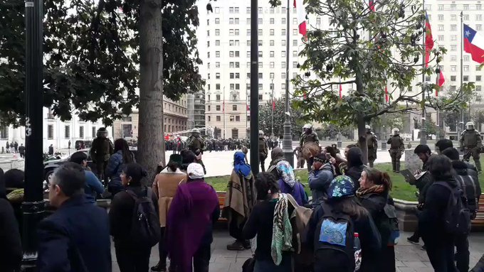 Mientras en el centro de la explanada se levantaba el telón que ocultaba el homenaje al ex presidente que se sentó en el sillón presidencial entre 1938 y 1941, por la calle Morandé, un grupo de manifestantes mapuche se agolparon aprovechando la oportunidad para pedir por el machi Celestino Córdova.